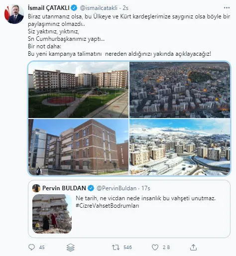 İçişleri Bakan Yardımcısı İsmail Çataklı, HDP Eş Genel Başkanı Pervin Buldan’ın Twitter’dan yaptığı “Cizre” paylaşımına, “Biraz utanmanız olsa, bu ülkeye ve Kürt kardeşlerimize saygınız olsa böyle bir paylaşımınız olmazdı.” ifadesiyle tepki gösterdi.